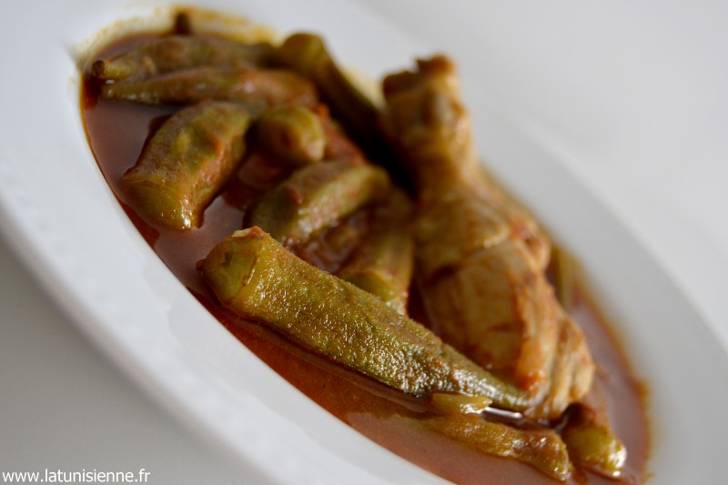 Ce plat est la seule façon en Tunisie d’agrémenter ce légume, qui se cueille prématurément avant de devenir fibreux. Les femmes le faisaient, et le font toujours d’ailleurs, cuire dans une sauce rouge avec de la viande d’agneau ou de chevreau, des tomates de saison, des oignons et des poivrons. Elles le faisaient également sécher en abondance, puis le suspendaient en chapelet dans le cellier (beit el-mouna), en prévision des rudes soirées d’hiver ou de ramadan.
